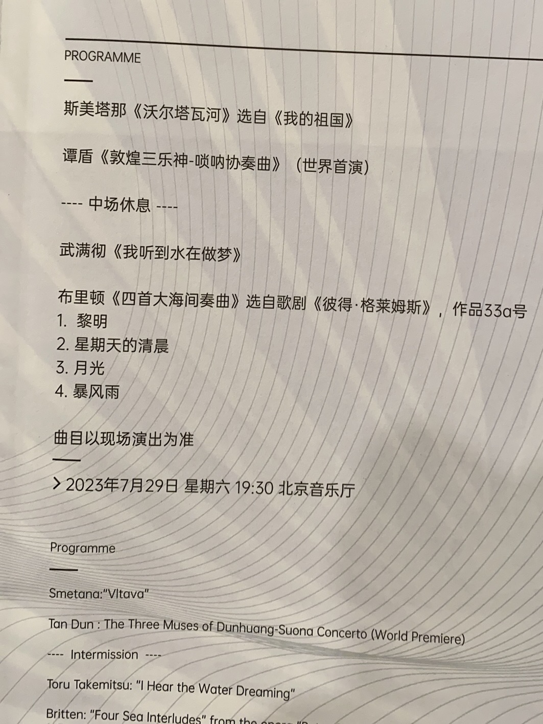 一个月前偶然看到了北京音乐厅的公众号推送,“上善若水”主题的音乐会早鸟票只要80块钱,之前去过的国家大剧院的门票都要两三百,加上还没有去过北京音乐厅,毫不犹豫的买了票,时间过的真快,转眼一个月就过去了,这好像也是我第一次正儿八经听音乐会,有点小期待~